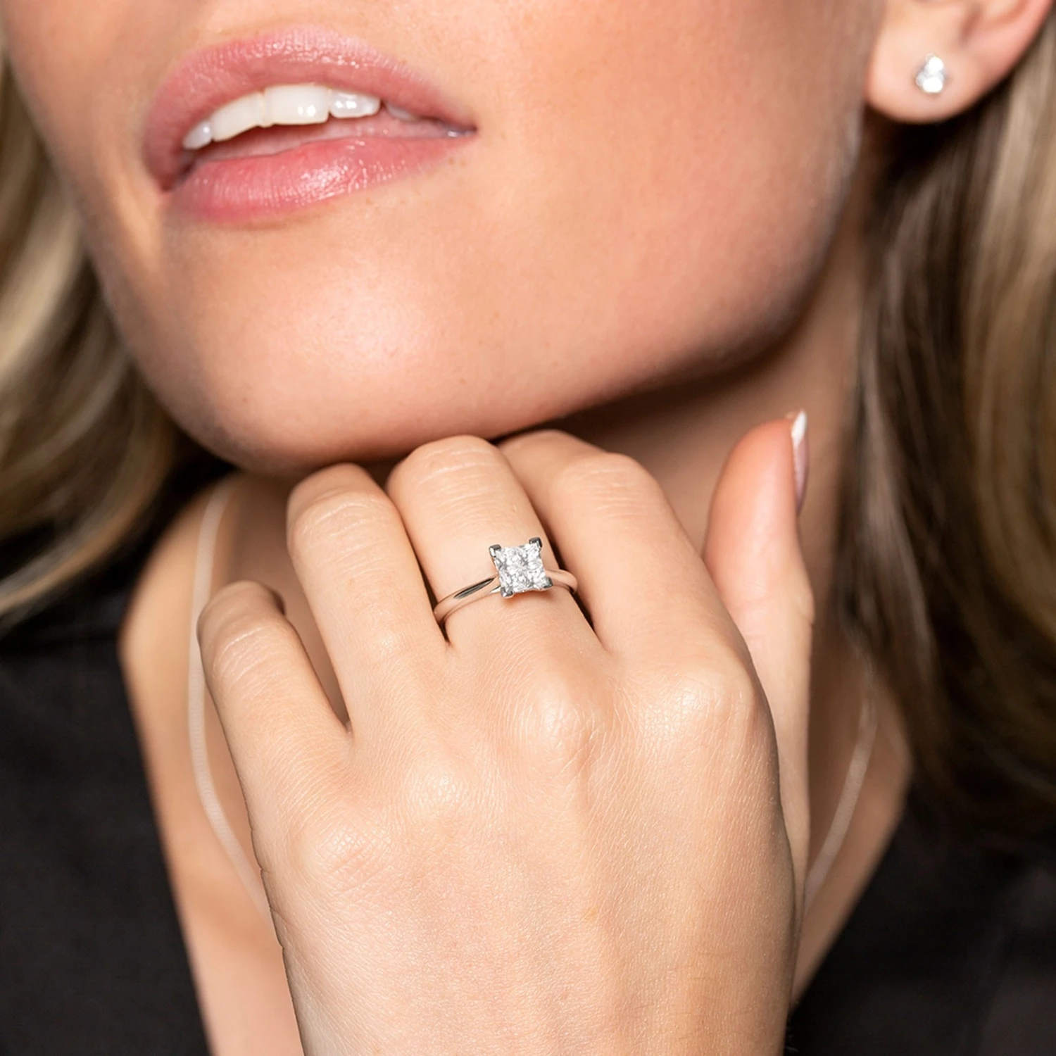 Begin the next chapter with your loved one by proposing with this stunning platinum tile cut cluster ring with a total diamond weight of 0.75ct. Displaying a romantic and classic style with its 4 princess cut diamonds, this ring will sparkle from every angle. Diamond Information: Cut- Princess cut, Colour- H-I, Clarity- SI1, Carat- 0.75ct