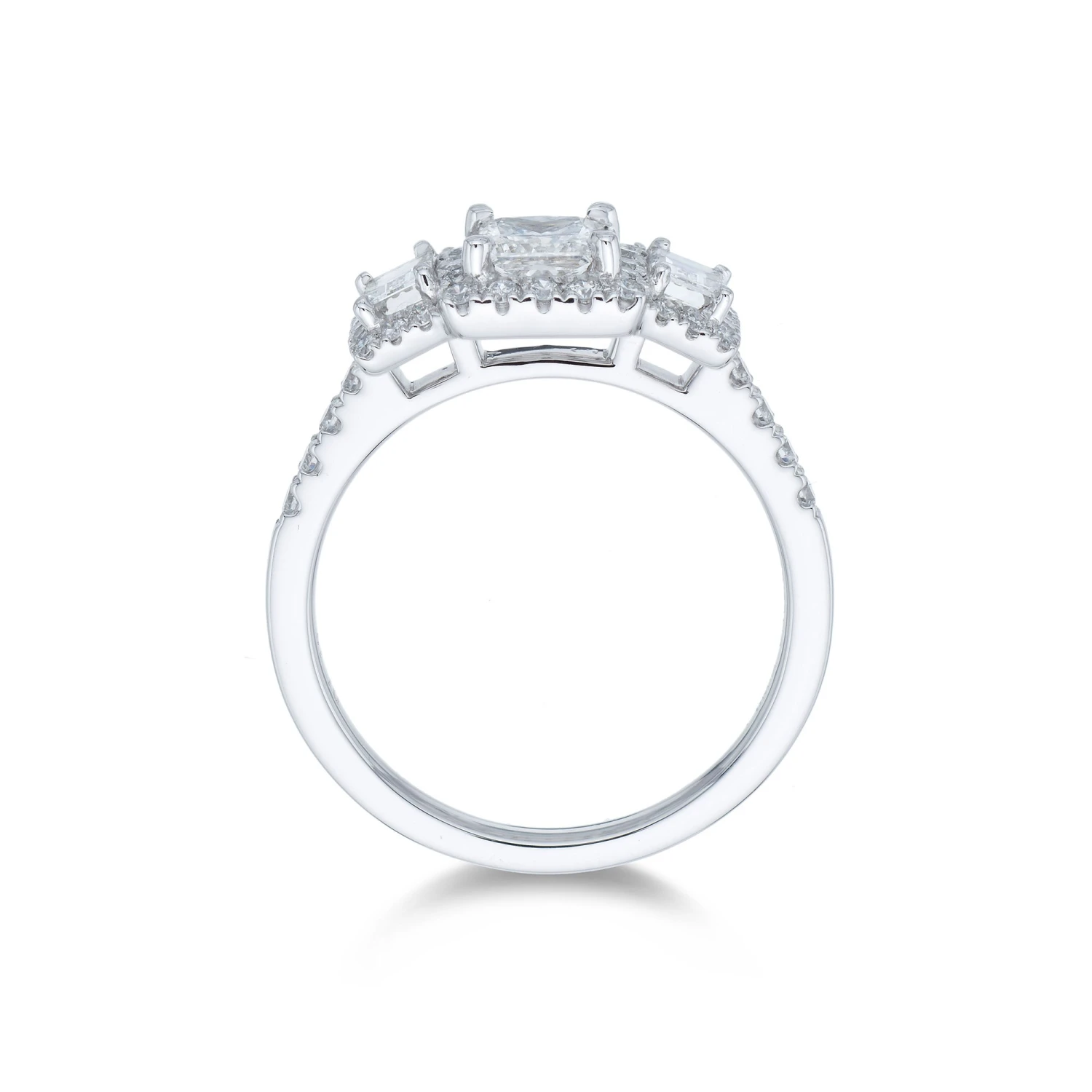Define timeless romance with this platinum princess cut three stone diamond engagment ring. Enhanced by a sparkling halo of brilliant cut diamonds and diamond set shoulder. Certain to steal your loved one’s heart and exclusive to Chisholm Hunter, this ring has an total diamond carat weight of 1.20.
