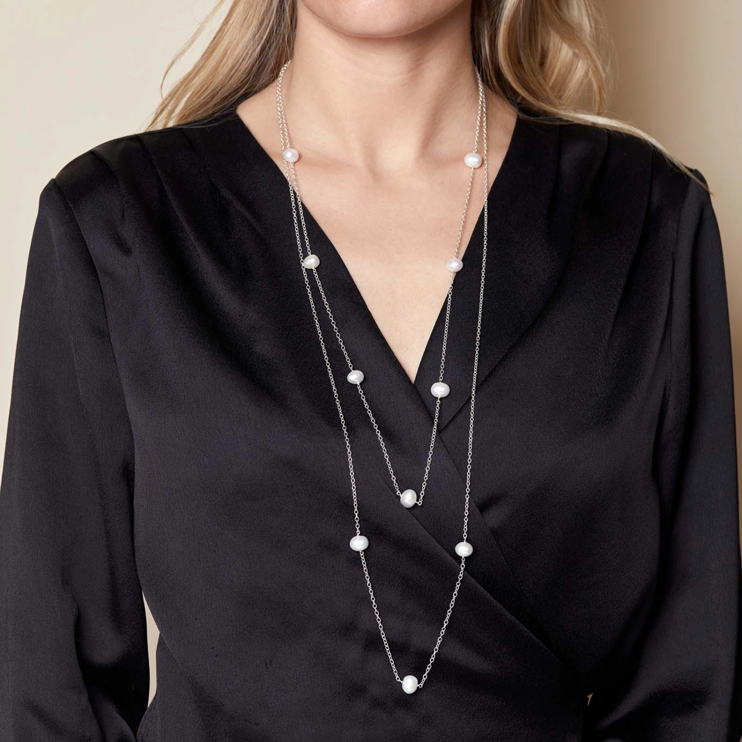 Complete your look with this opulent silver pearl necklace. A classic jewellery style with a modern twist, this piece features radiant fresh water pearls presented in a station design. This necklace is the perfect piece to spoil a loved one.