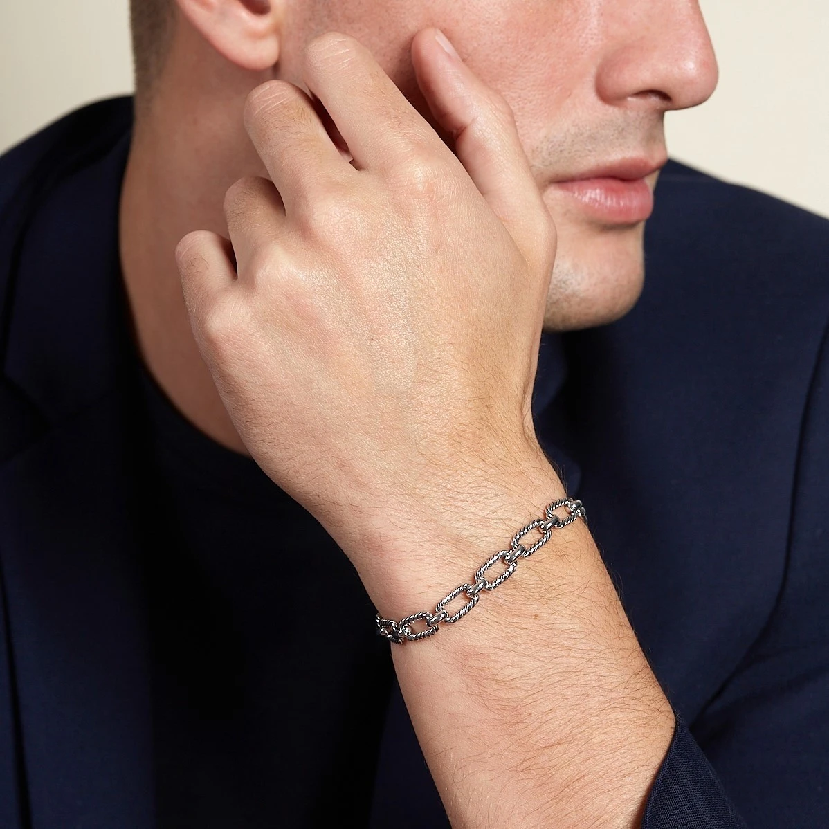 A great addition to your everyday collection, this textured twist link mens bracelet can be worn on its own or stacked with a sleek timepiece for extra impact. The simple design features a sturdy sterling silver bracelet with lobster claw fastening.