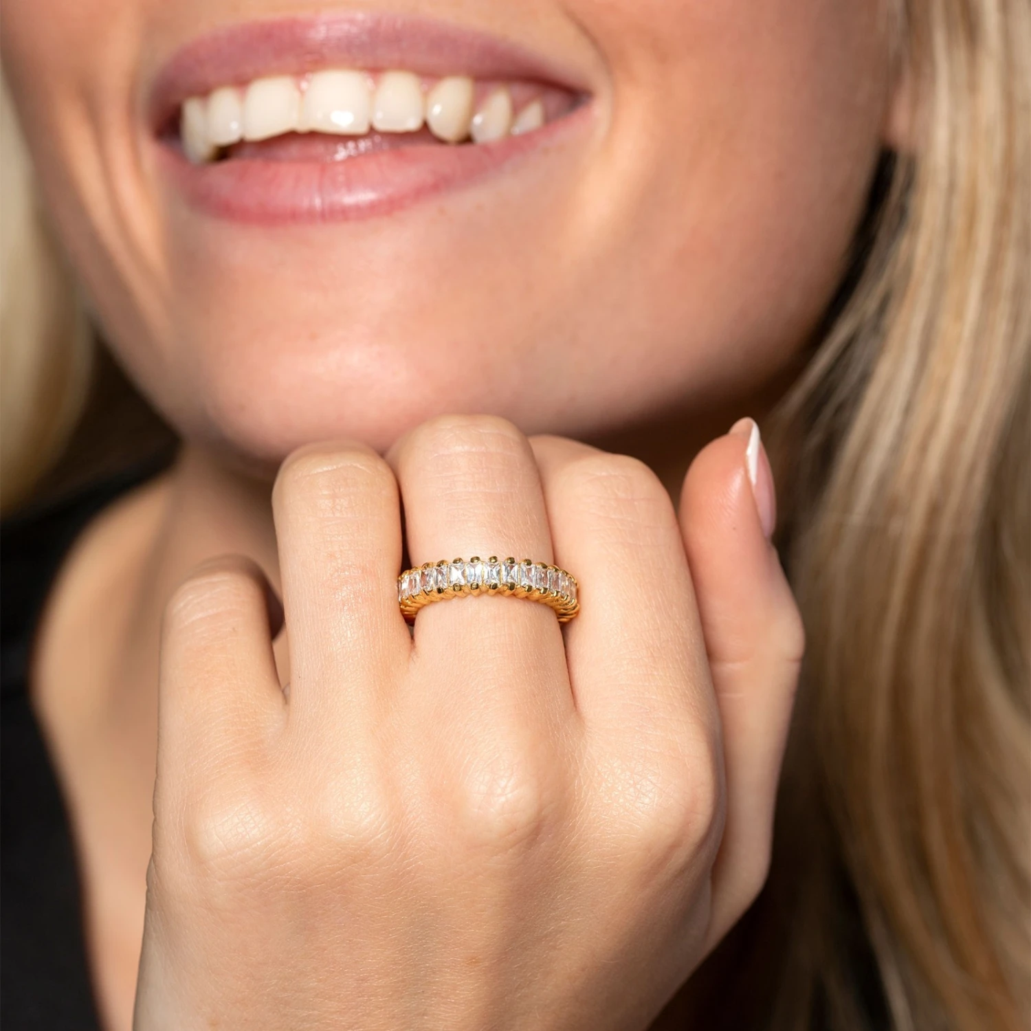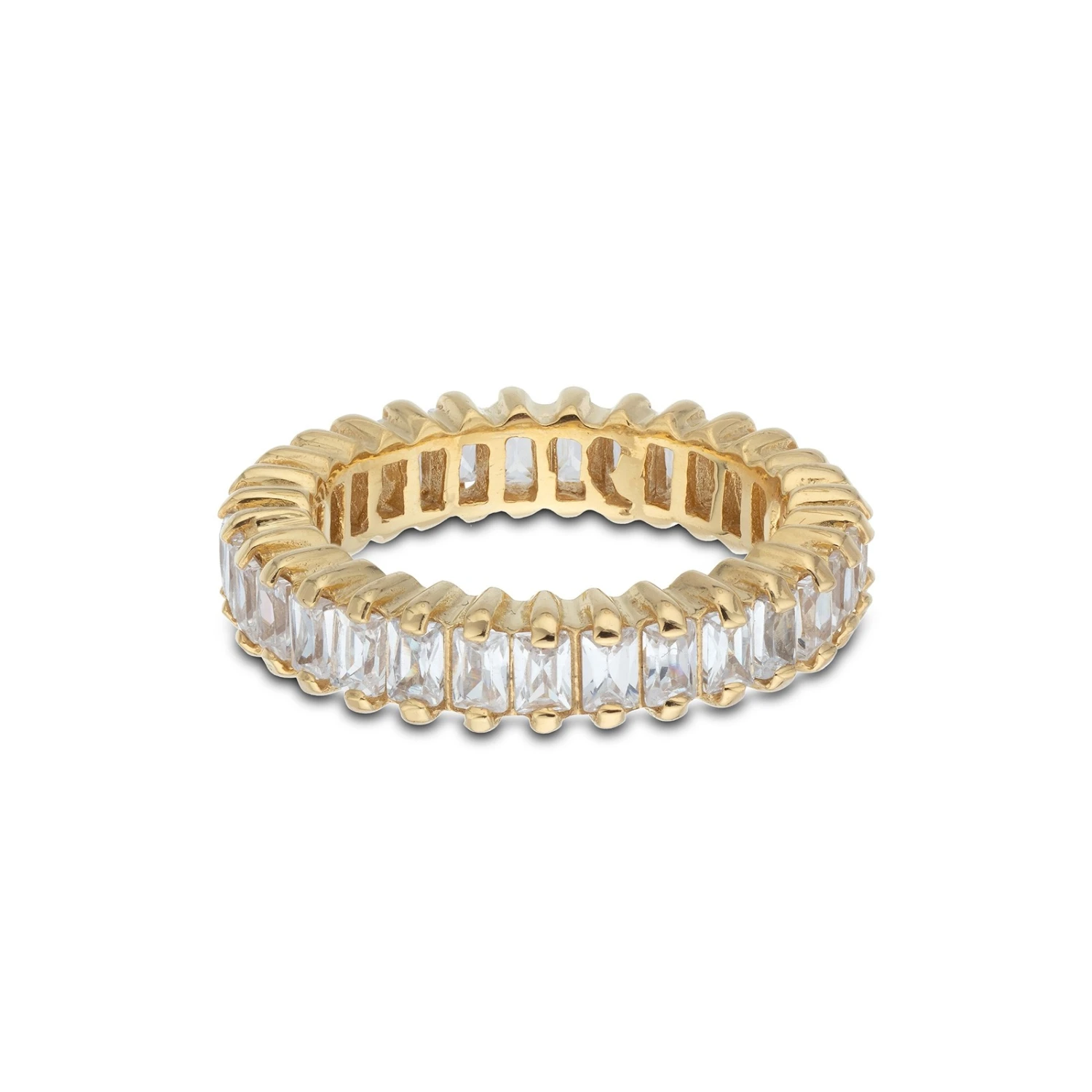 Be on trend season after season with the stylish Sterling Silver Yellow Gold-Plated Rectangular Cubic Zirconia Ring. This impressive ring features a row of rectangular cubic zirconia stones held in place in a two-claw setting on a beautiful yellow gold-plated sterling silver band. This ring is perfect for stacking with multiple gold rings to create a chic look. Presented in Chisholm Hunter gift packaging.