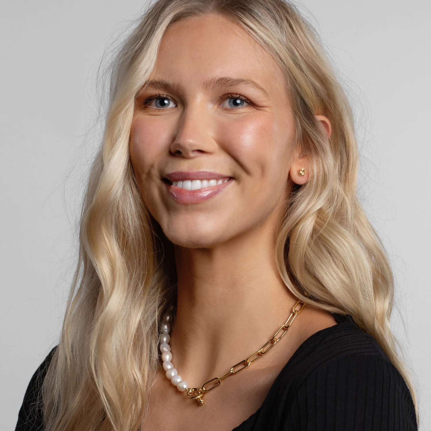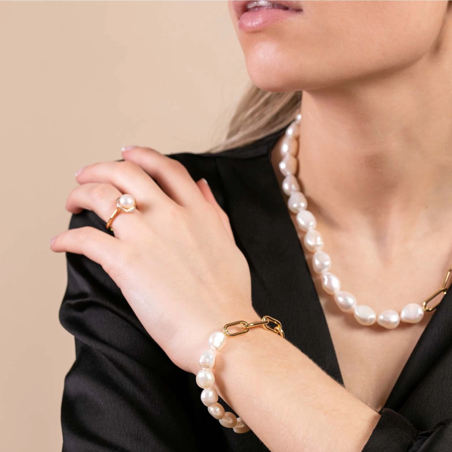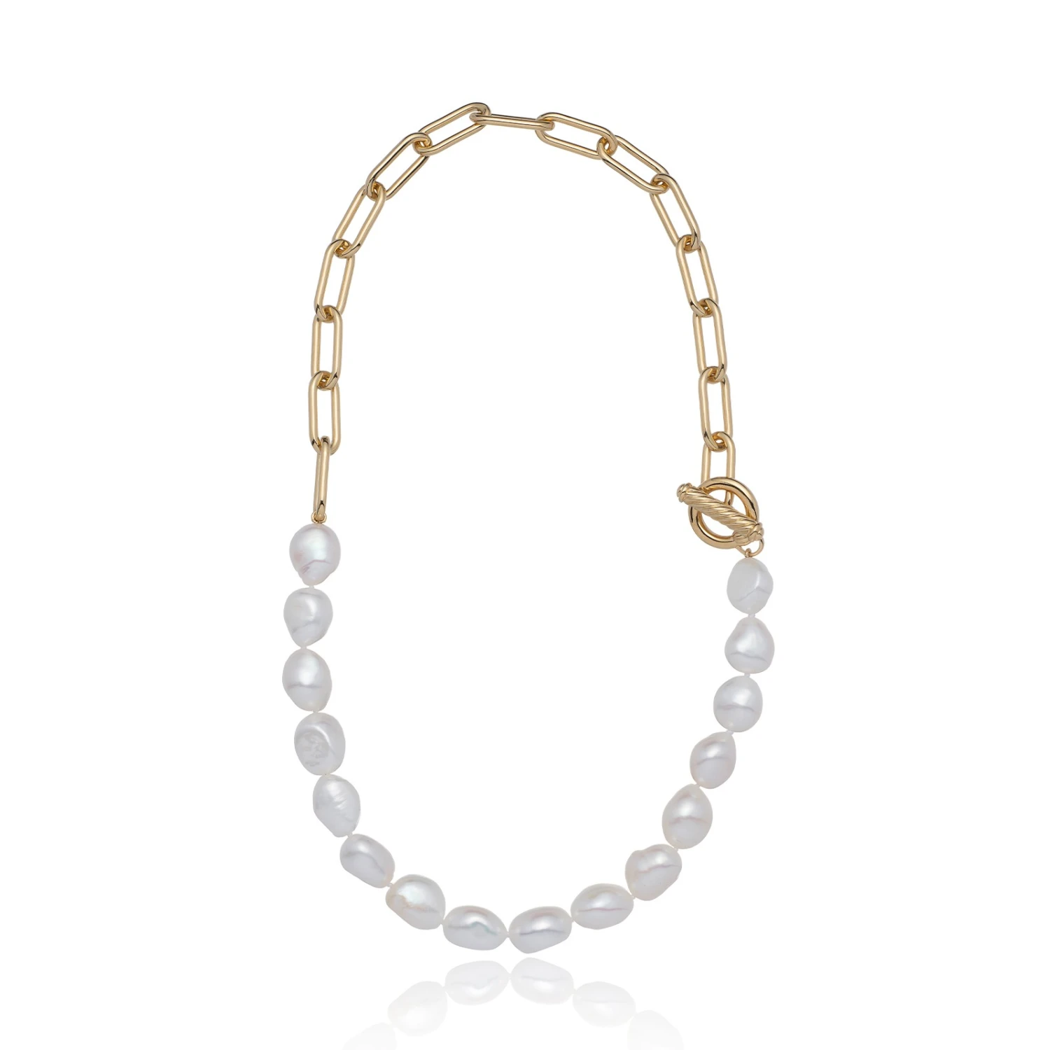 The perfect gift for the one you love, this yellow gold plated link T-bar pearl necklace defines luxury and glamour. Radiating timeless grace and elegance with its freshwater pearls measuring at approx 10-11mm, this piece is guaranteed to make that special someone feel like royalty.