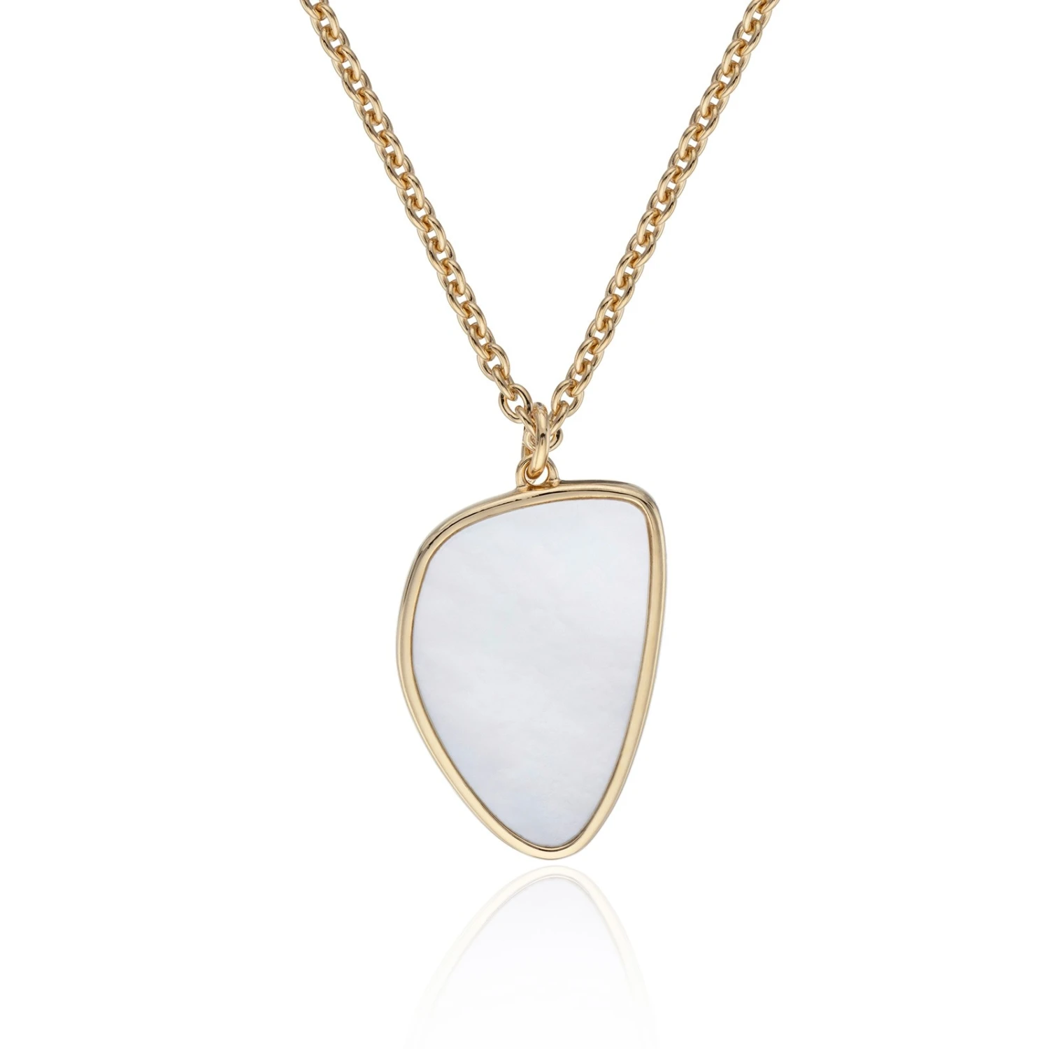 Abstract styling set with stunning Mother of Pearl creates a striking contemporary statement pendant that can be effortlessly worn for any occasion. Expertly crafted in 925 Sterling silver and plated with 3 micron yellow gold for a sophisticated and luxurious look, this eye-catching piece can be styled with matching items and is sure to become a much admired addition to any jewellery collection.